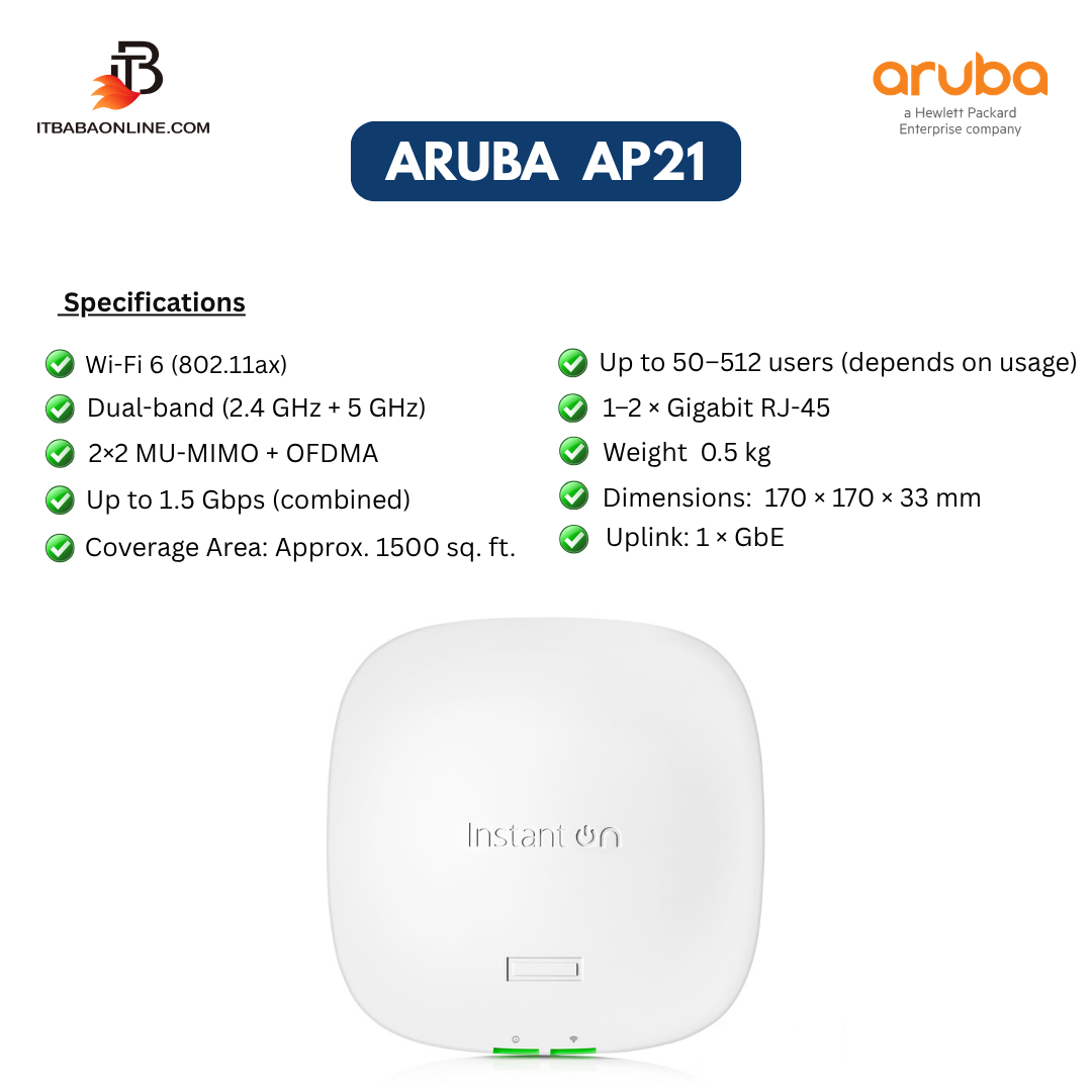 The Aruba AP21 Access Point, part of HPE Aruba Networking, is a powerful indoor wireless solution built for modern business environments. With WiFi 6 (802.11ax) technology, it delivers faster speeds, improved capacity, and reliable performance for multiple connected devices.